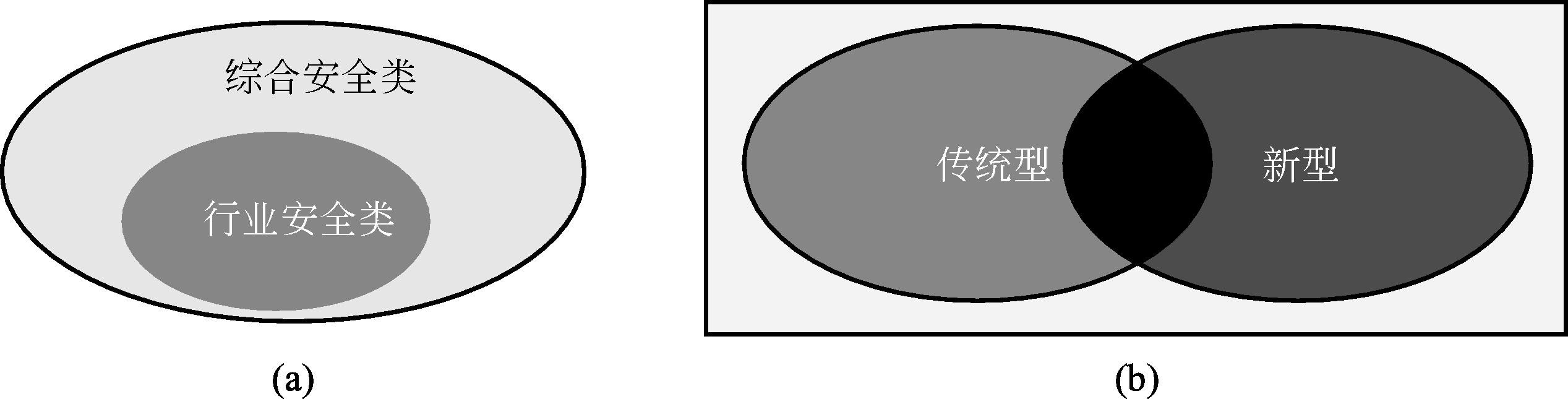 模糊性主要体现在其归类方面,如从内容覆盖范围角度分类的模糊性体现在:一是除有些安全标语明确表示所使用范围或要求外(如行业安全类),使用具有针对性,还有部分安全标语所反映的内涵放置于任何地方皆宜(如综合安全类),使用具有普遍性,同时,说明综合安全类包含行业安全类,见图2-3(a);二是安全意义类、安全管理类、事故致因类、安全教育类、安全哲理类、安全祝福类、安全家庭类之间也存在部分交叉。从时间角度分的传统型与新型安全标语之间有时没有明显界限,该模糊性特征见图2-3(b)。