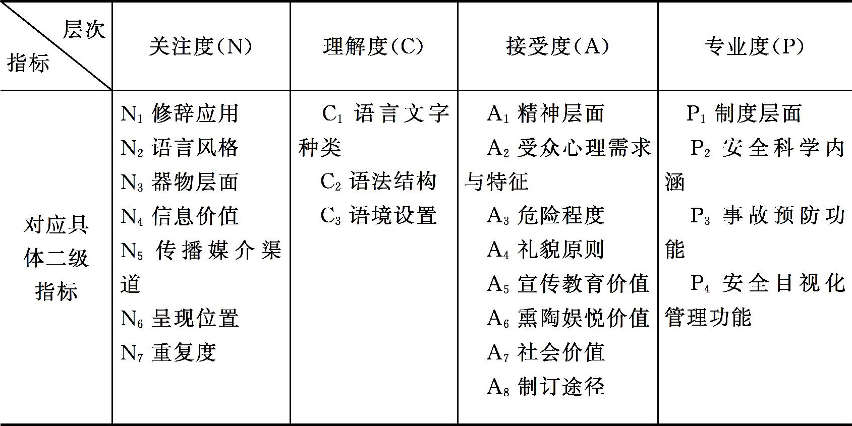 按关注度(N)、理解度(C)、接受度(A)、专业度(P)四个一级层次要素,可将安全标语的5类22个评价指标因子进行重新归类,归类结果见表5-5。