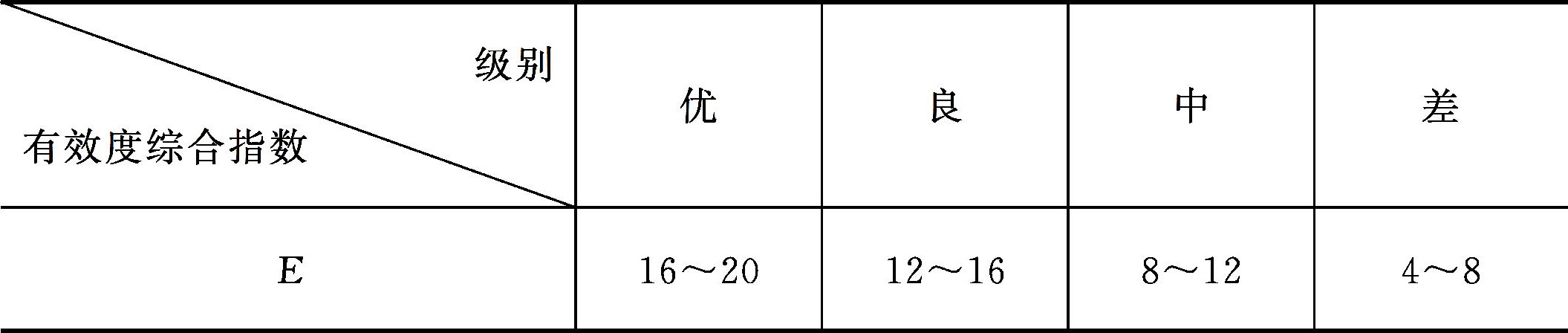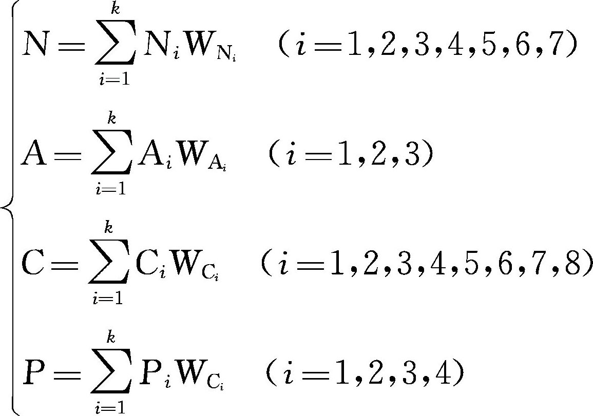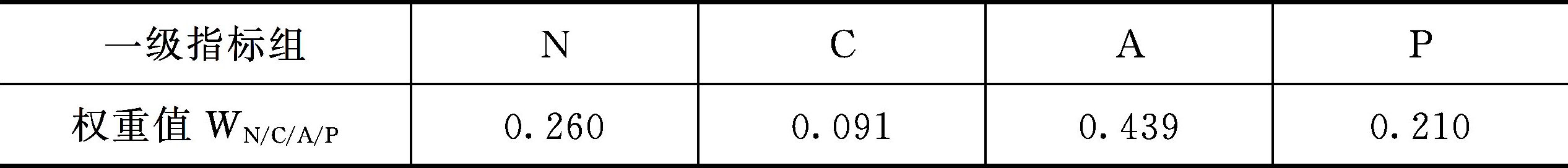 式中, E 为有效度综合指数; N 、 C 、 A 、 P 依次为一级指标组的有效度指数; W N 、 W C 、 W A 、 W P 分别为各一级指标组的权重值。