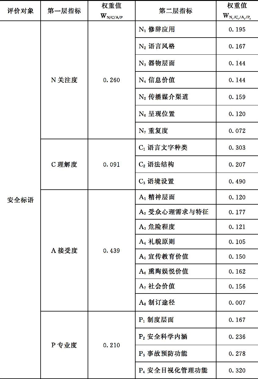 关注度是指人们对某一特定事物观察和记忆的程度。安全标语的关注度(N)是指特定范围的受众对于发布的安全标语的阅读和记忆的程度,是衡量安全标语发布效果的重要指标,主要包括表中的7个二级指标。