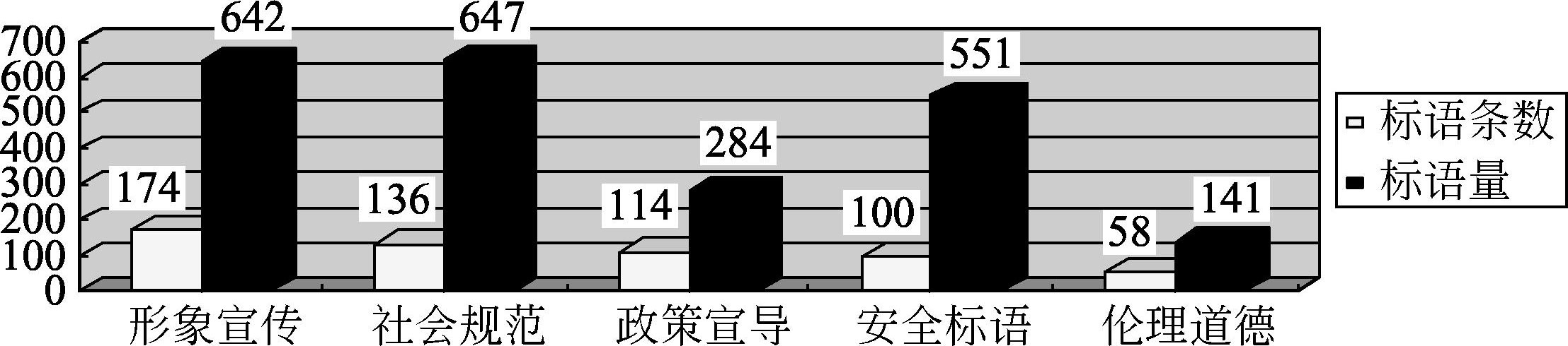 安全标语作为标语的一种,在日常生产、生活中与其他各类标语相比,所占比例较大。2005年,张佳按发布目的对上海市户外非商业性标语做过调查分析(见图1-1)。调查数据表明,安全标语虽然仅有100条,但总量达551条,占5类标语总量的24.3%,位居第三,同一条安全标语的数量达到5.5条,重复率最高,这说明社会发展对安全标语的需求极高。而这仅是对上海市户外非商业性标语的调查,若走进企业,安全标语更是随处可见。由此可知,我们的生产、生活已经离不开以众多安全标语作为安全宣传教育载体来保障人们生产、生活安全、健康开展。