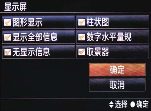 方向键选择所需要显示的选项,然后按下控制拨轮上的中央按钮添加勾选标志,选择