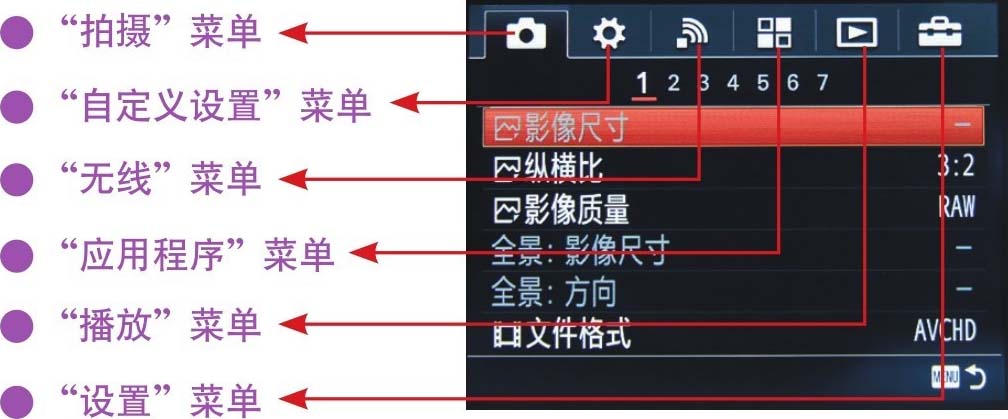SONY α7共包含“拍摄设置”、“自定义设置”、“无线”、“应用程序”、“播放”以及“设置”6个菜单项目。