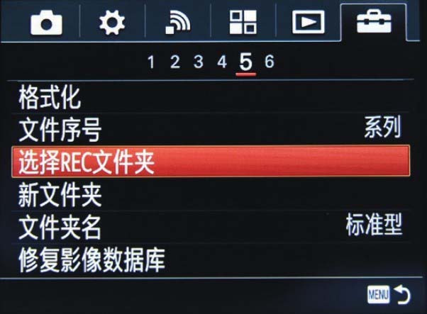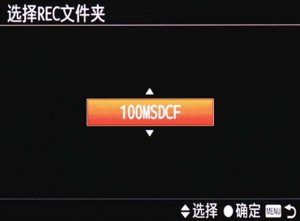 当在“文件夹名”中选择“标准型”时,如果存储卡中有两个或更多的文件夹,可以通过“选择REC文件夹”来设置以后拍摄的照片要存放在哪个文件夹中。