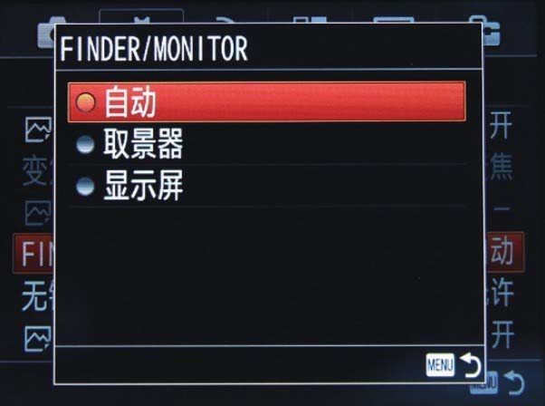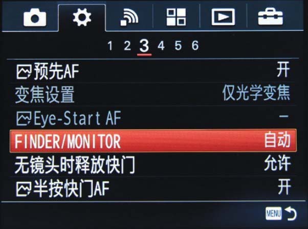 在默认情况下,当摄影师的眼部靠近取景器时,显示屏中显示的内容将自动切换至取景器继续显示,但这种显示方式非常耗电,因此,如果需要的话,可以在“FINDER/MONI TOR”选项中改变此设置。
