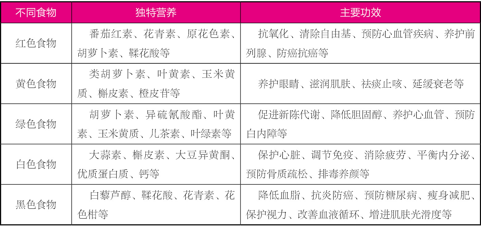 提到食物搭配,我们常想到的是荤素搭配、粗细搭配。其实,大自然赋予我们各种各样、五颜六色的食物,是在告诉我们:要食用不同种类、颜色的食物,以全面获取身体健康所需要的各种营养素(见表1-1)。