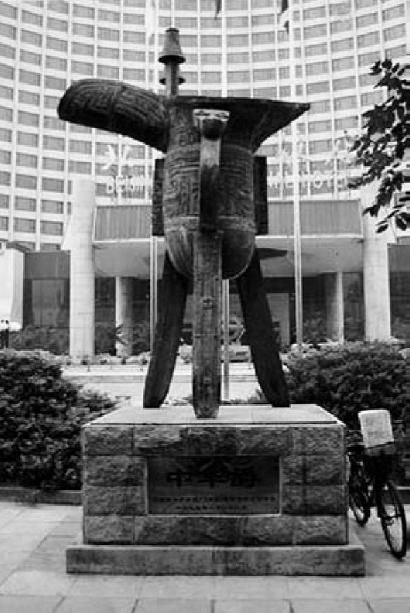 通过再造青铜器和摹仿书法的形式、风格来与古代相交的做法,在经历了20世纪的许多动荡后仍保存下来。古代青铜器的形状和设计以许多意想不到且生动的形式展示给世人,例如北京国际饭店前摆放的大铜爵就是一例【图5-11】,该饭店客房里的毛巾上也装饰着爵的字样。这些物质相当迷人。那些能将过去展现在这些物质形式上的人们,似乎能更进一步地宣告对过去及其价值的掌握。这种操控有些近乎神奇。来往于北京大街上的行人能察觉出这件爵不相称的尺寸,但这种夸大的做法强调了过去的美德和价值,并将这些价值与一座建于20世纪的宾馆联系在一起。