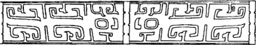 商周时期,应用这些规则的纹饰或部件经历了若干主要的变化。为了理解图5-2鬲上所示的羽旌纹的渊源,我们必须回到商代早期(约公元前1500—前1300年)的青铜器。商代的青铜器装饰可分为两个主要阶段。第一个阶段是早于安阳时期以及安阳早期的典型阶段,此时的部件由涡纹及羽旌纹构成,它们组织在眼睛周围,表示动物的面部(有时称之为罗樾Ⅰ—Ⅲ式)。