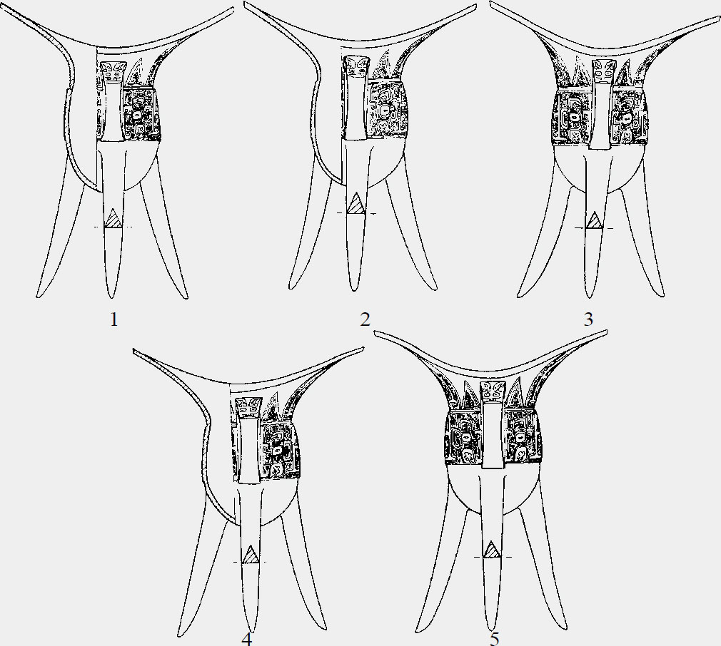 而且它们与商代晚期更常见的形式不同,后者将圆形器身支在柱状或尖锥状足上。器顶上的管状流,以及开口周围的两个眼睛,也同样是依据更早的形式。在其过渡阶段,盉顶部的面部设计已经消失。