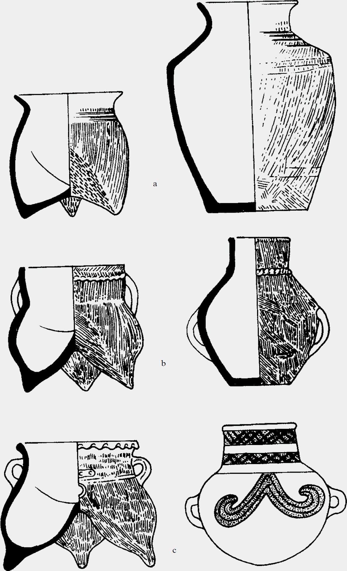 除了这种三足器外,相同的族群也可以由某些特殊类型的罐分辨出来。其中一种类型的陶罐带有斜肩,器身最宽处有两个小环耳,器底为平底或圜底(参见图2-5b)。另一种类型的颈部带有双耳,第三种类型的陶罐则只有单耳。这些陶罐都与商人的主要器形不同,后者为斜肩、平底、无耳(参见图2-5a)。这些陶器类型不仅将陕西西部和东部的居民区分开来,还使我们有可能向更西部追踪这些族群的来历。分裆鬲和双耳圆罐这两种陶器类型已发现于甘肃和陕西西部更早的、属于新石器时代的辛店文化和寺洼文化中【图2-5c】。