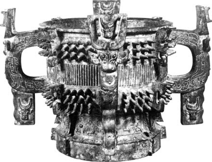 因此,四川彭县和陕西西部的宝鸡是两个主要的地点,在此发现了长久以来被认定为具有西周早期特征的青铜器,它们带有动物雕塑和钩形扉棱。据此我们可以进一步推测,这种明显流行于西部和西南部的奇特风格,发源于更早的青铜器传统,该传统把处于商都邑文化区之外的湖南、四川、陕南和渭水流域这个弧形区域连接起来。