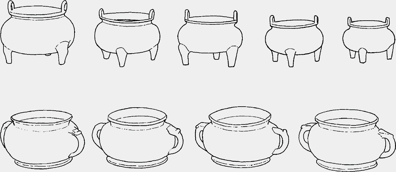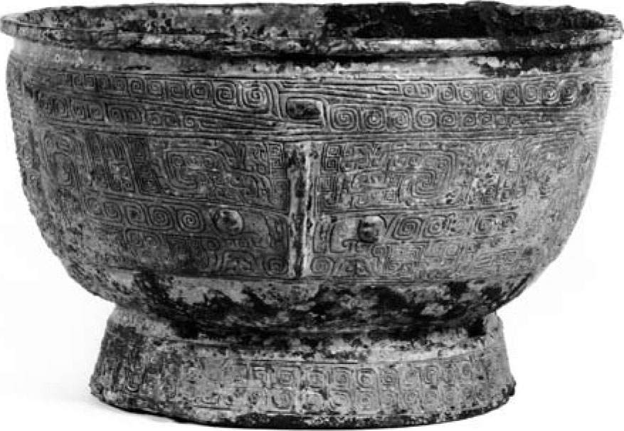 伯和他的妻子各自拥有几件彼此不同的鼎和簋;他的妾则拥有一套简易组合的鼎,器表没有花纹,器形也完全一样【图2-18】。和图2-17上半部所示的后来的簋一样,这些器物并未打算让人细细观察,似乎希望在人们的匆匆一瞥中传达出正确的信息。这一简易的组合宣告了之后的发展方向。在改变礼仪的决定在周的都城西安及周的礼仪中心扶风、岐山付诸实行的同时,西部地区使用完全相同的成套食器的做法似乎被采纳为新的标准。