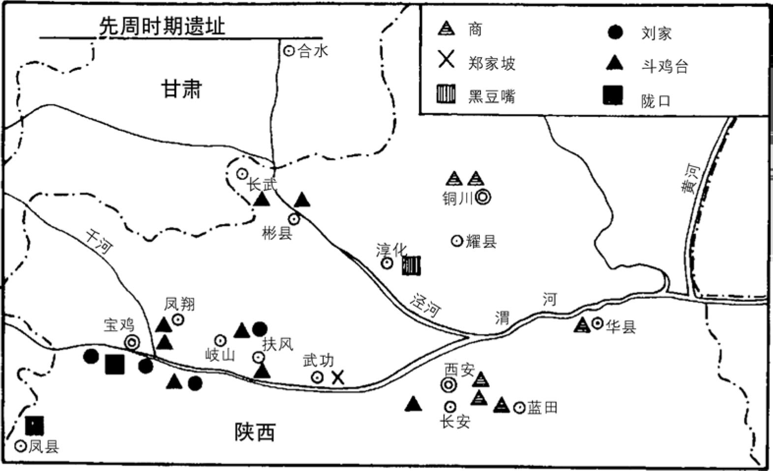 这种十分特别的鬲在分布于渭水上游及其支流泾水的遗址中都有发现。这些遗址属于斗鸡台和刘家类型【图2-6】。这种鬲带有三个内部相互分隔的袋足【图2-5b】。每个袋足都是模制的,可能是以现成的器物为模型。