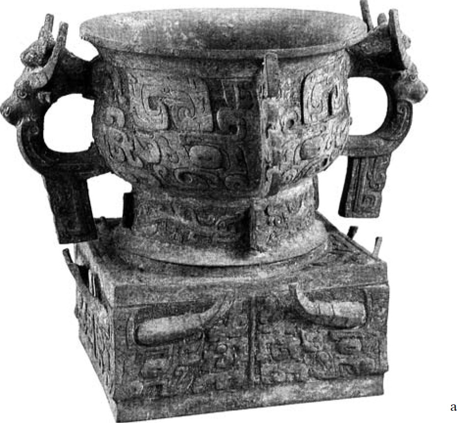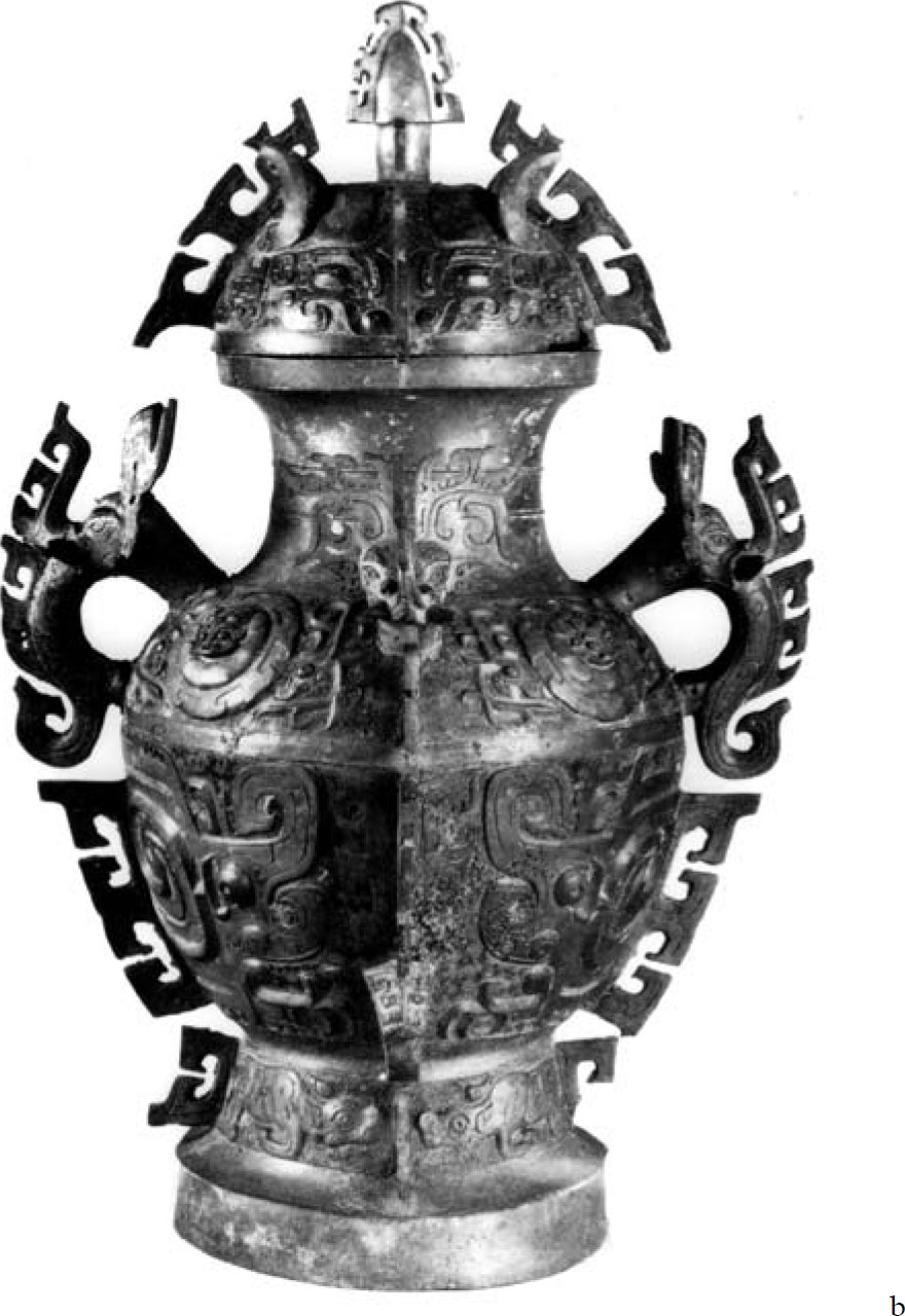 【图2-2b】是周代的簋,较之商的同类器物,它在各个方面都显得笨拙一些:其腹部相当呆板地向外伸展,器表纹饰单调而粗糙。【图2-3a】所示的一件现藏于华盛顿弗利尔美术馆的簋更为引人注目。其宽大的双耳和尖锐的突起装饰,使之具有侵略甚至是野蛮的特征。
