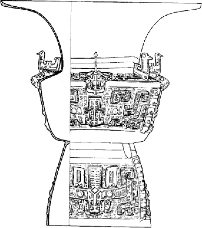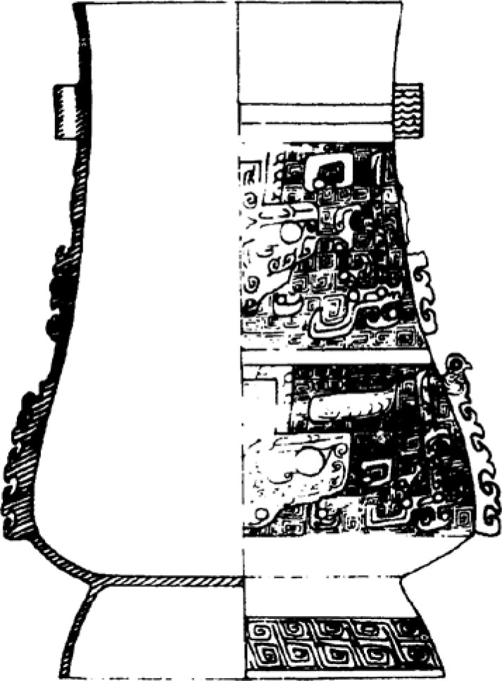 在许多这类周边地区的尊上,饕餮纹以浮雕的线条来描绘,且常带有近乎三角形的耳(参见图2-12a、2-12b、2-14)。尊的肩部以钩形冠兽首和小鸟装饰代替扉棱。这可能是四川那种饰以鸟形扉棱、突起角的罍(参见图2-8b)和宝鸡发现的簋(参见图2-8a)的原型。不过,这些后来的青铜器夸大了早期尊上的动物圆头和鸟形扉棱。
