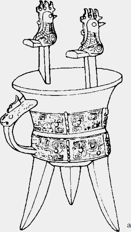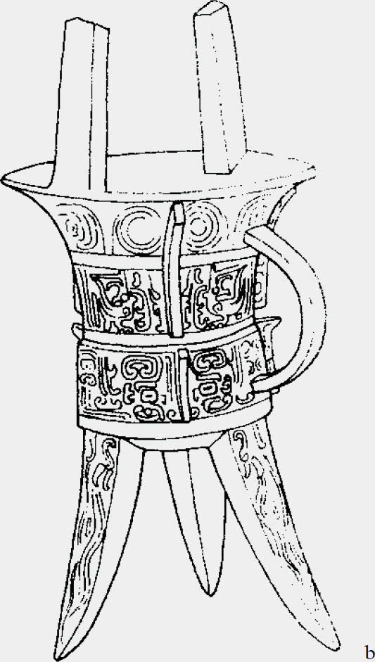 两件铜斝说明了早期的器形和装饰母题如何延续到晚商和西周早期,并为西周早期怪异的青铜器提供了灵感。【图2-15a】的斝和一些晚商青铜器一同被发现于陕西岐山