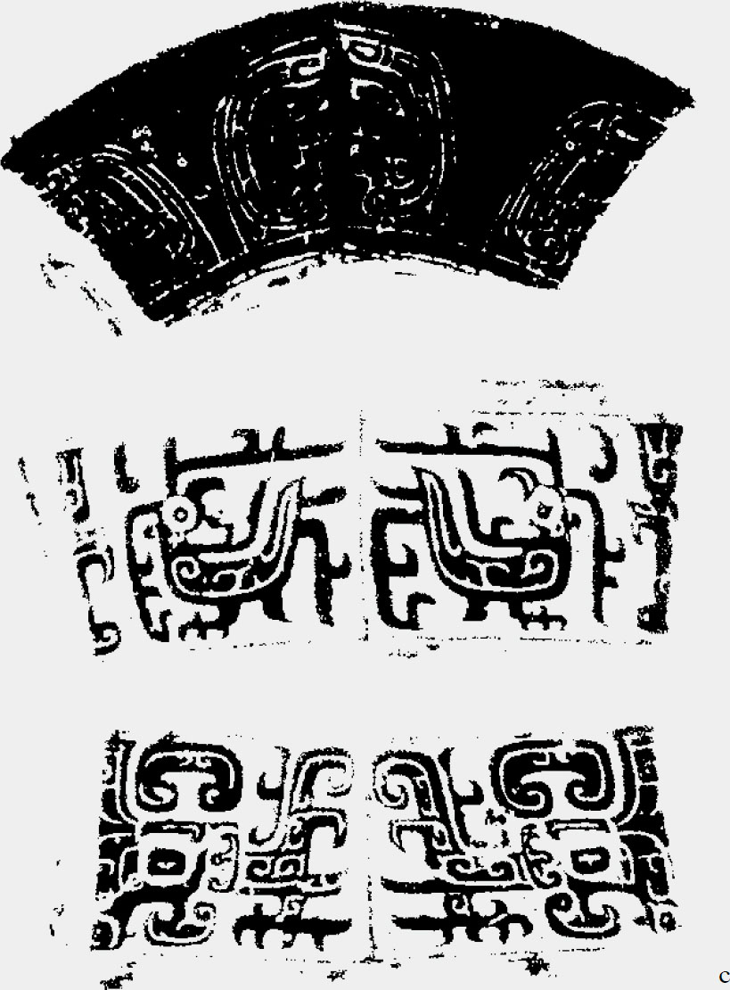 因此,像这样一件来自南方或是仿制南方器物的青铜器,其存在的时间超出了那些南方青铜器流行的时期,和传统的晚商青铜器一起使用并受到珍视。第二件斝显示出一种早期的形制如何在西周前期又被重新采用【图2-15b、2-15c】。它的器形与前者相似,因此反映的是公元前13世纪的青铜器。但是它的凤鸟纹不早于西周早期,或可定为公元前10世纪以后的纹饰(参见图2-15c)。因此,像图2-15a中斝这样的青铜器留存到后来的时期,并被仿制成像是图2-15b的那件斝。通过这种方式,在远离商朝中心的地区,较早的地方特色被西周早期的奇异青铜器重新采用,并加以改变。