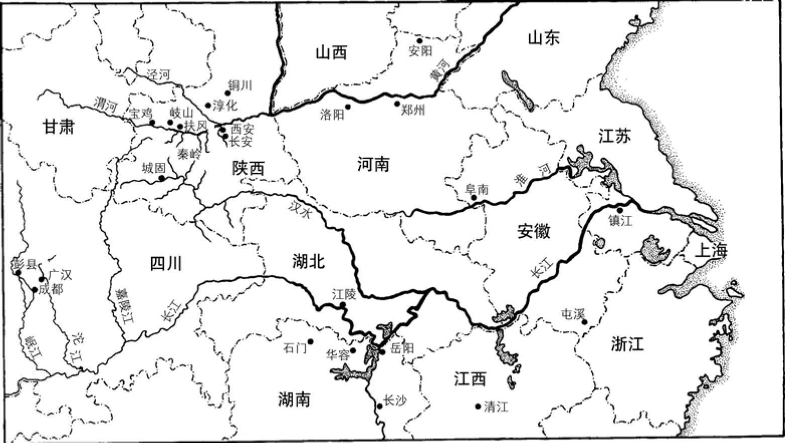 然而,在对我们的论述十分重要的其他遗址,如湖南岳阳、华容、石门等地发现的青铜器表明,长江也是一条主要的传播路线,它向北顺支流经过四川的广汉和彭县,再环绕宝鸡附近的秦岭。