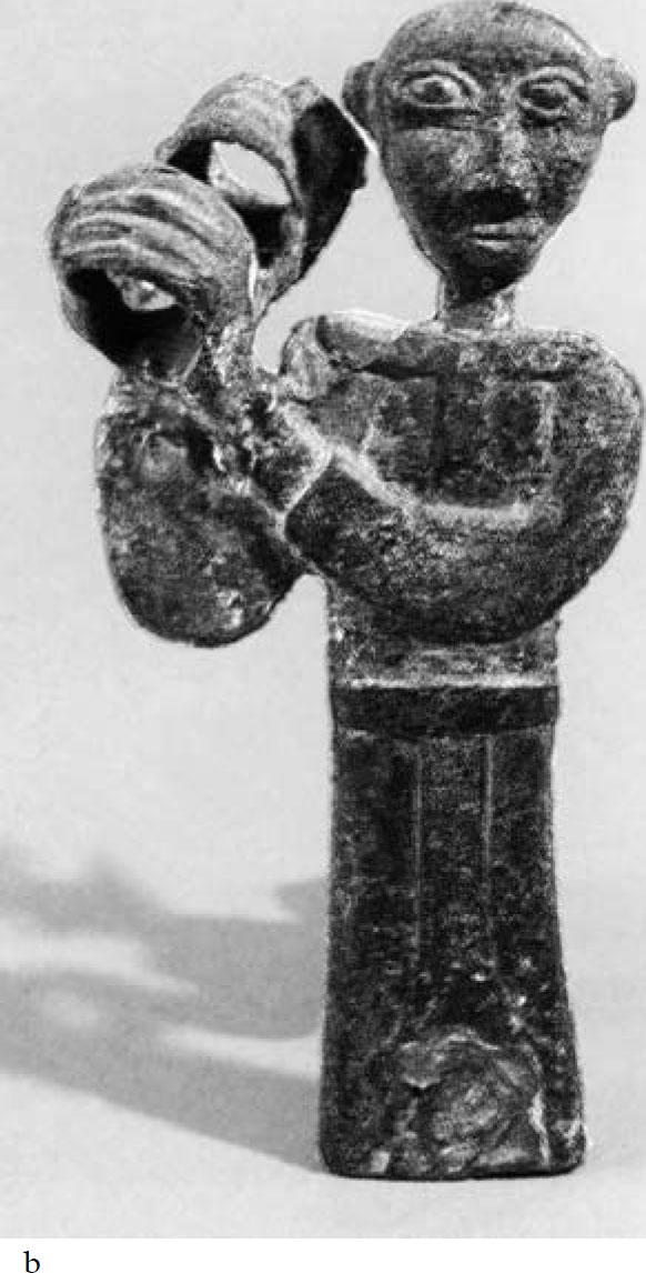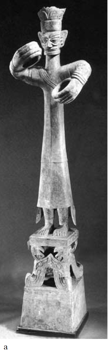尤为引人注目的是,宝鸡茹家庄小型人像(图2-11b)对广汉大型雕像(图2-11a)中大手的模仿。