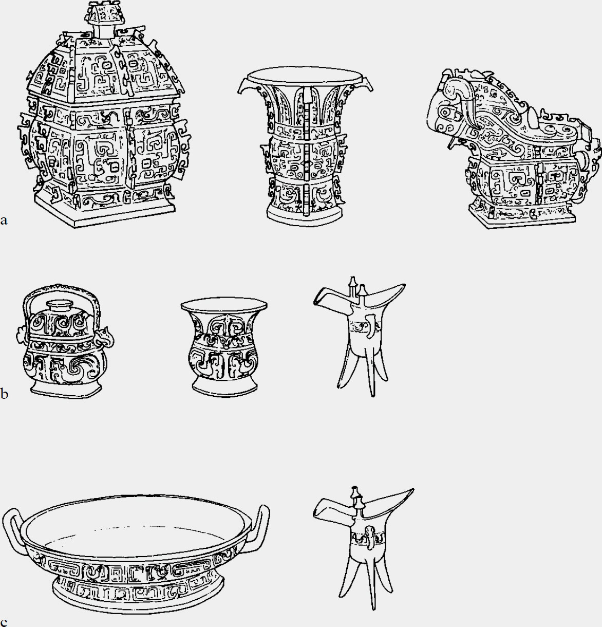 在属于较早年代的青铜器中,酒器占有优势。的确,现存青铜器说明了第一代人致力于青铜器中最复杂的酒器类型,如方彝、尊和觥【图2-16a】。第二代人仍拥有相同类型的器物,但尺寸较小【图2-16b】。这一家族,甚至是整个国家的命运似乎正在走下坡路。相同的器型仍被第三代继续使用【图2-16c】。然而到第四代时,突然产生了令人惊异的变化。几乎所有的酒器都消失了,代替酒器的是成套的食器,它们采用完全相同的和相匹配的设计【图2-17】。大型铜壶是唯一的酒器。在几种新出现的青铜器类型中,大型编钟最引人注目。