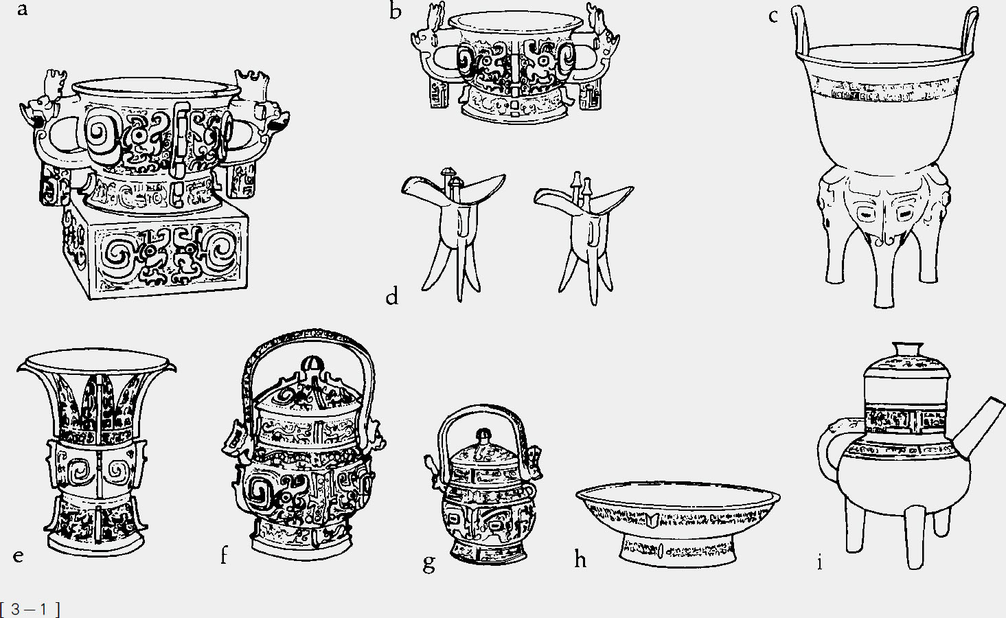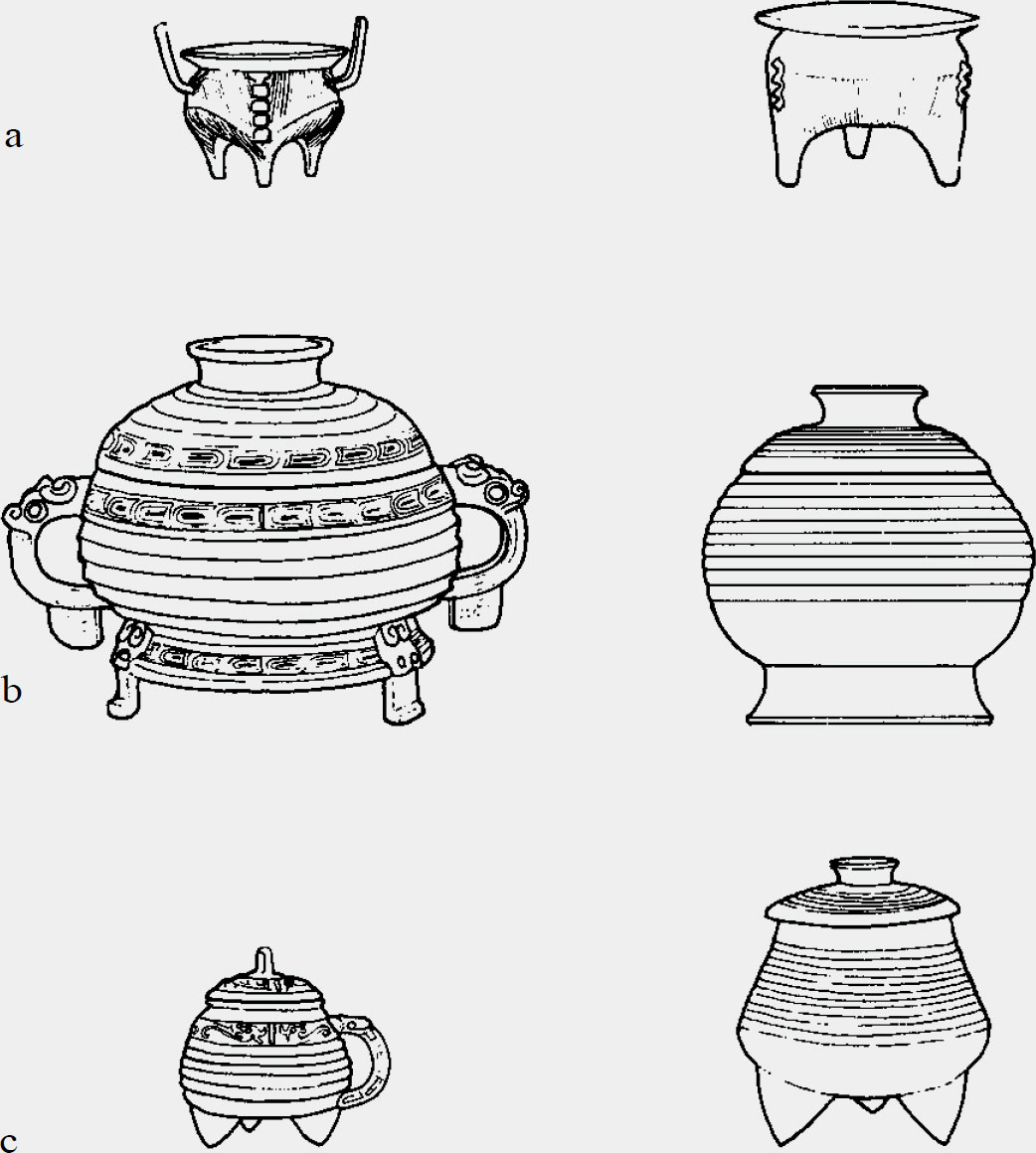 这一变化中最显著的特征,体现在对由陶器器形发展而来的一些新器形的使用,以及它们对旧有形式的取代。这里必须强调,以贵重的铜来仿制廉价的陶器是多么不寻常。一般情况下,最初用贵重材料制造的物品,后来都会为更低廉的材料所复制,以便使原先对于大多数跃跃欲试的使用者来说太过昂贵的物品可以得到广泛使用。因此,相反的过程总是很少见的。当青铜铸造首先在河南出现时,这一(相反的)过程曾经发生过,因为当时铸造工匠可用的主要模型就是新石器时代的陶器。当青铜铸造技术传播到对该技术知之甚少的地区时,这种情况也会发生。新的器型鬲、簋和蓥【图3-5】,可能是在中国西部,即西安附近周的主要都城的西边发展而来的。青铜铸造在当地可能不如在都城那么为人所知,因此用青铜仿制常见的陶器类型是很自然的事。
