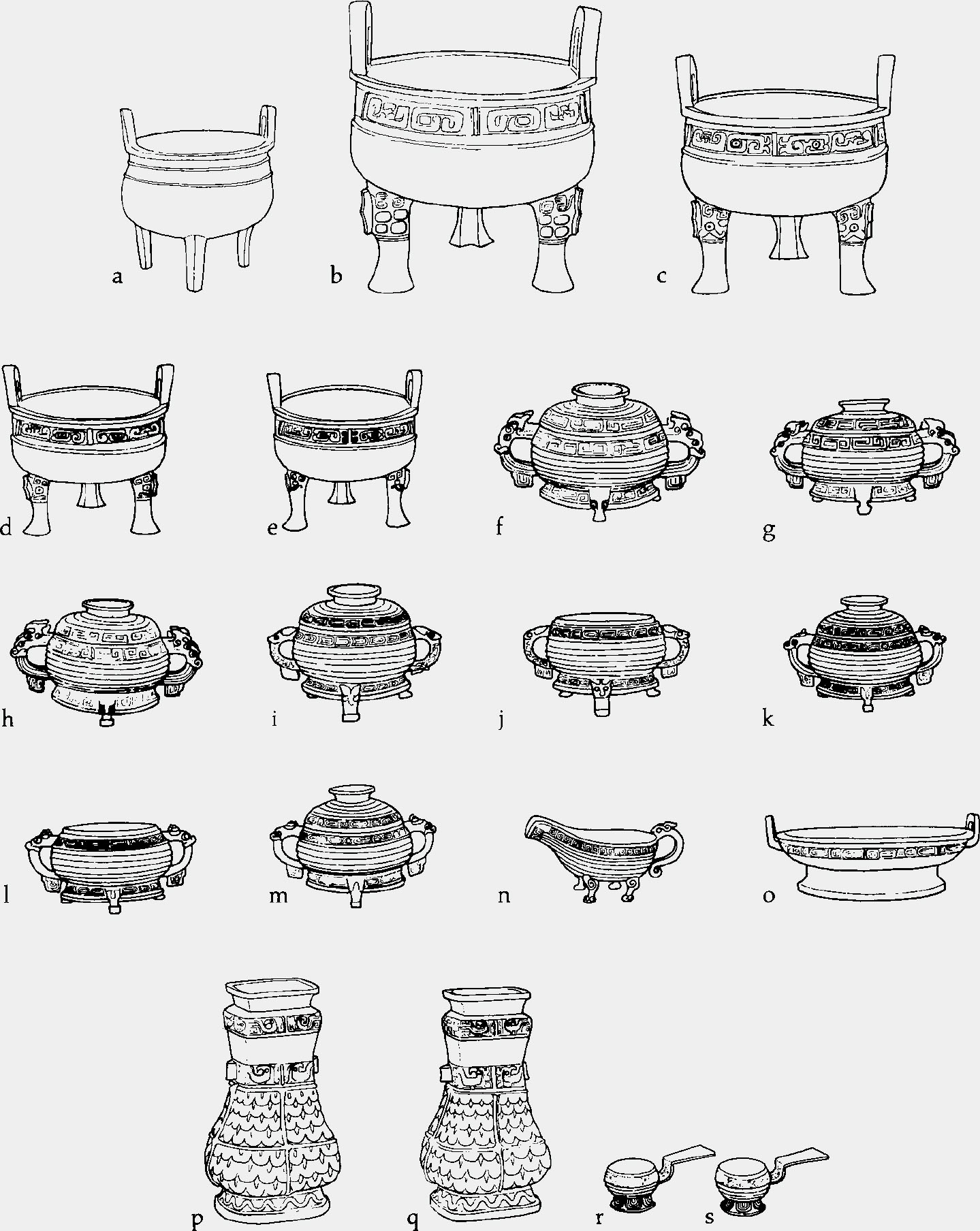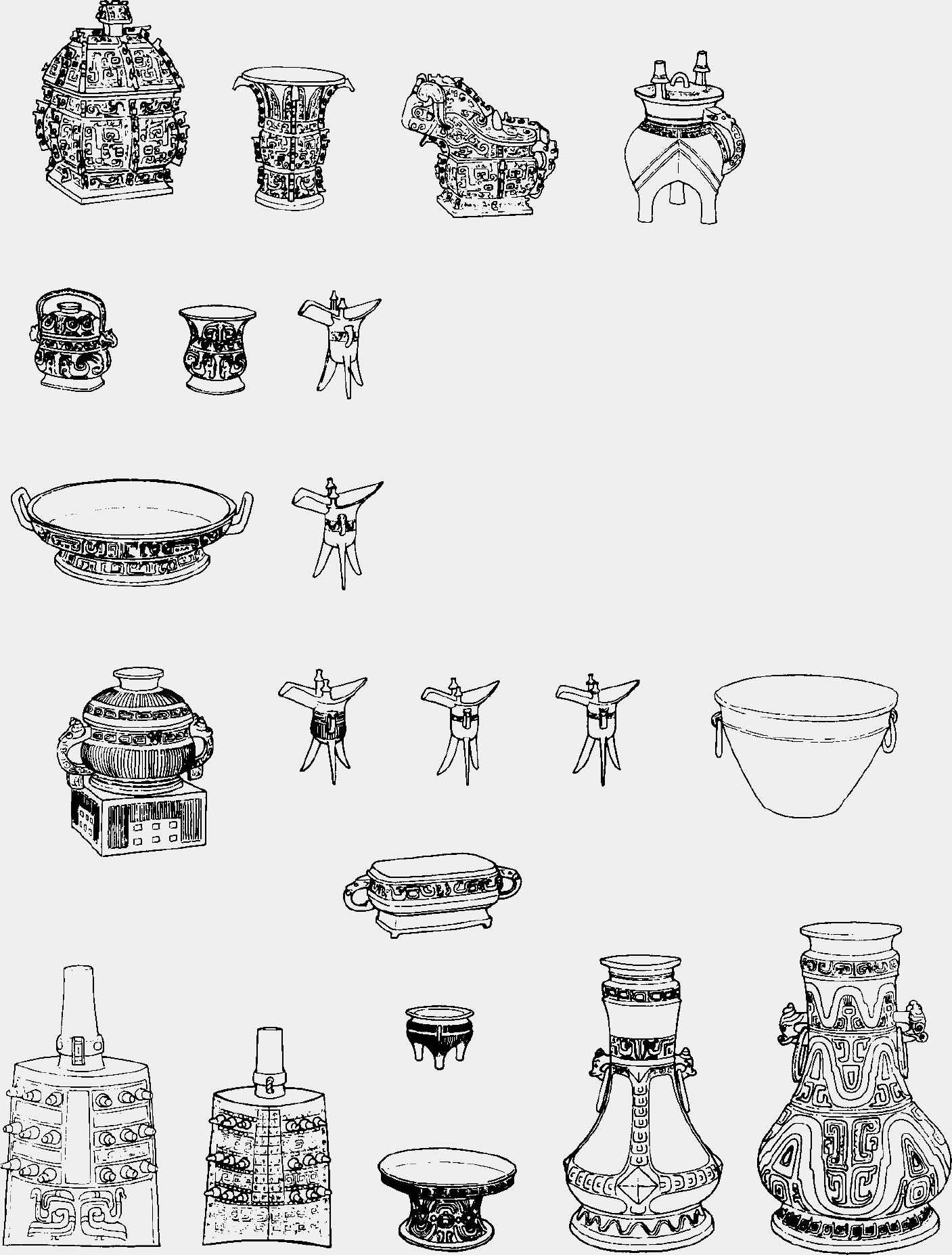 要了解器物类型如何演变,最好是通过祭祀祖先的成套礼器。在此,一套器物可定义为某一家族或个人在某一特定时期对祖先进行酒食祭祀时,所需要的一组反复出现的不同类型的器物。这一定义忽略了地位较高的个人为一套礼器带来的复杂性,例如商王武丁的妃子妇好,她的墓中就保存着远远超出上述定义的青铜器。