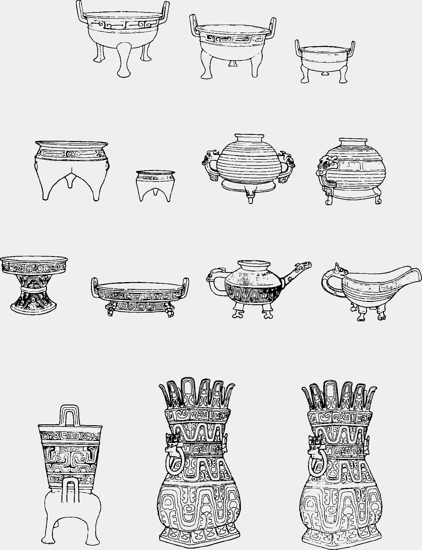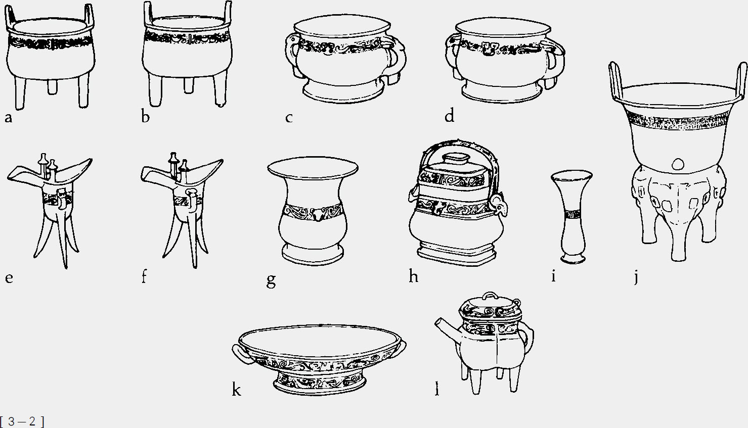 因此,典型的西周早、中期的成套青铜礼器包括以下器类:食器(成对的鼎、侧面为S形的成对的簋、单件甗)、酒器(成对的爵、一件或两件觚、单件觯、圆尊、一件或两件卣)和水器(单件盉及盘)。