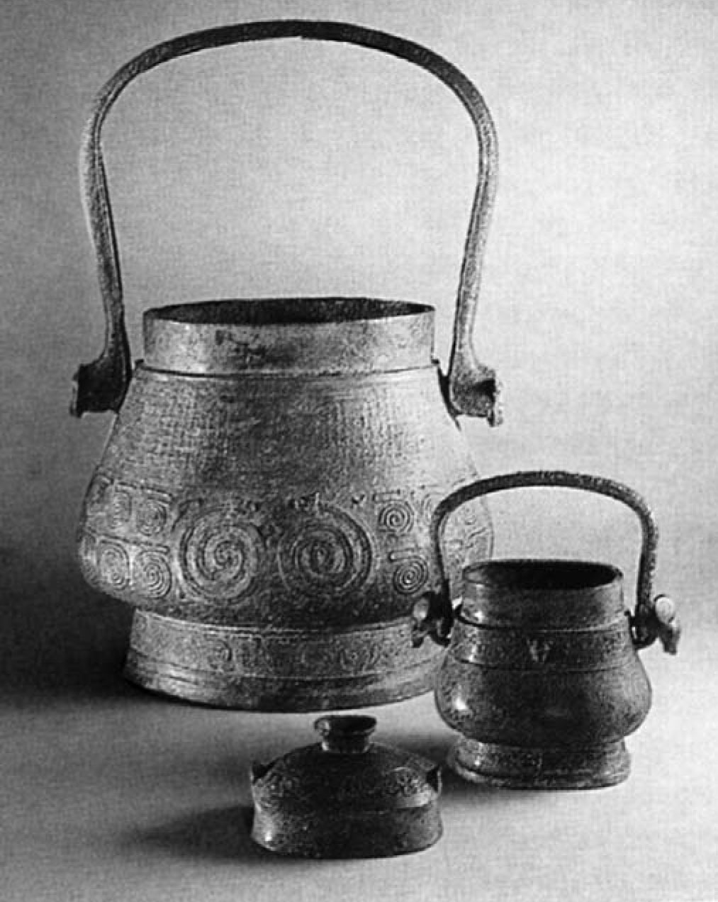 西周末年,联系又重新建立起来。这有可能是因为西部都城在犬戎的入侵下陷落,导致周贵族成员南迁。湖北京山宋河区窖藏出土的青铜器就仿造了北方礼器的器型,其中有成套相配的簋和鬲(代替了鼎),以及二件大型壶、豆、匜和盘【图3-6】。