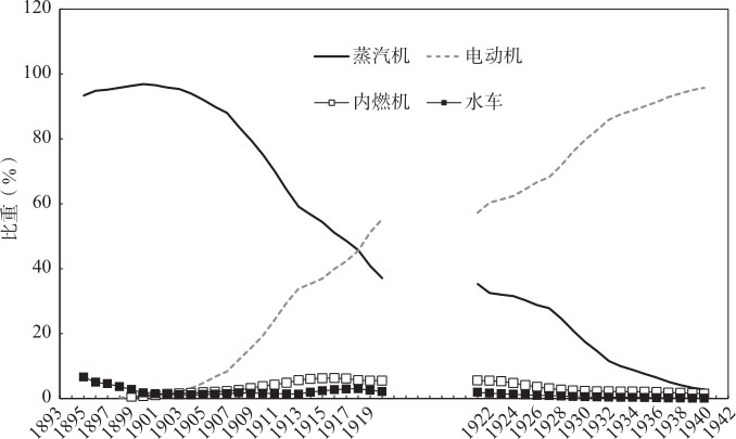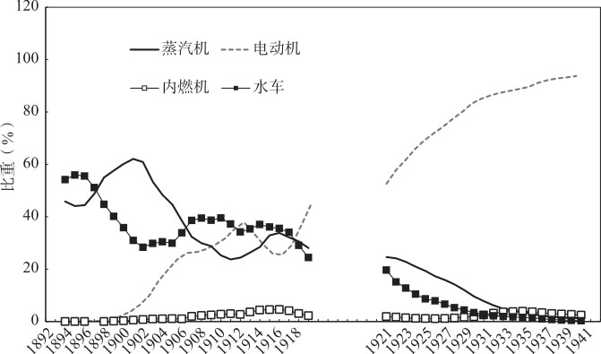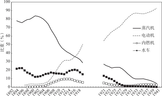 各种原动机马力数占全部动力马力数的比例变化在14个地区有4种类型,这些类型显示在图5-2、图5 3和图5-4中。首先,所谓第一次动力革命,即从水车到蒸汽机的转变,从水车和蒸汽机占全部马力数的比例可以观察到。全国平均虽然没有画在图中,但应该相当于图5-2和图5-4中间的水平,蒸汽机的比重在1900年之前持续上升,在世纪之交达到90%的水平,进入20世纪以后直到1940年都一直在下降。与蒸汽机的变动相对照,水车的份额在1900年前后逐渐下降之后,到1920年有一定程度的上升。从这种蒸汽机和水车的变化看,南亮进主张的第一次动力革命是成立的。