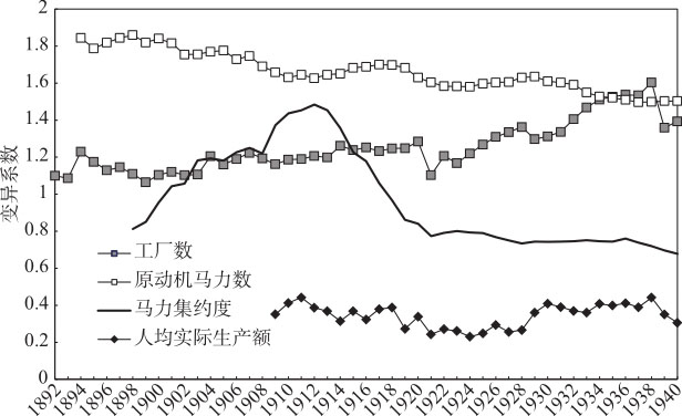 马力集约度(这里作为资本密集度的代理变量)初期随着原动机的普及,地区之间的差距快速扩大,这时只有较大规模的工厂能安装原动机,因此地区之间的马力集约度的差距比较大,后来随着电化的进步,地区之间的差距开始缩小。人均生产额(这里是实际劳动生产率的替代变量)也基本上与其相似,由于电化的效应,在1920年以前地区之间的差距逐渐缩小。也就是地方的工厂由于原动机的使用和电力的采用,生产手段得到了改进(技术进步),因此劳动生产率提高了。然而由于城市的其他要素的作用,如交通、物流、信息等方面的优势,20世纪20年代以后又重新拉大了差距。