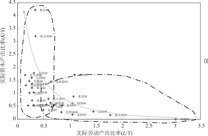 最后观察一下,经过几十年的技术进步和发展,日本各地区的生产函数明显地出现了变化,这种变化的方向是从劳动密集型向资本密集型转变。图5-6显示了这种情况,整体上各地从1909年比较偏向于从横轴右下角向纵轴左上角移动。这个图是按照近似生产函数画的,横轴为实际劳动产出比率(也称“劳动系数”),纵轴是实际资本产出比率(也称“资本系数”),图形中的曲线理论上就是等产量线。一方面,等产量线表示,在相同要素投入量的情况下,越是接近原点就越节省成本(或投入),表示技术进步。另一方面,如果处在图中的右下角则表示劳动密集型,处在左上角则是资本密集型。图中的绝大多数地区在1909年处在右下角,而在1940年则移动到了左上角,这显示了技术类型的变化。