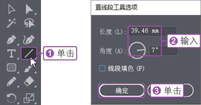 ,在画板中直线段开始处单击,打开“直线段工具选项”对话框,②在对话框中输入“长度”为39.46mm、“角度”为7°,③单击“确定”按钮。