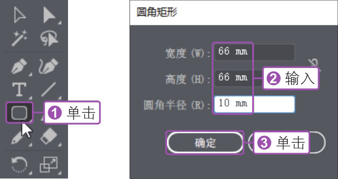 ,在画板中单击,打开“圆角矩形”对话框,②在对话框中输入“宽度”为66mm、“高度”为66mm、“圆角半径”为10mm,③单击“确定”按钮。