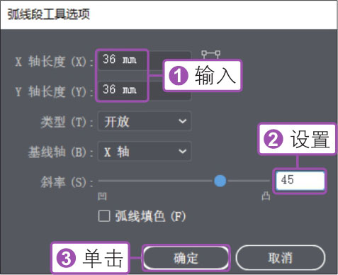 打开“弧线段工具选项”对话框,①在对话框中输入“X轴长度”为36mm、“Y轴长度”为36mm,②设置“斜率”为45,③单击“确定”按钮。