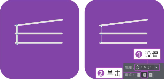 将鼠标指针定位到三条直线段左上方位置,按住【Shift】键不放,单击并向下拖动,绘制一条垂直直线段,打开“描边”面板,①在面板中设置“粗细”为1.5pt,②单击“圆头端点”按钮