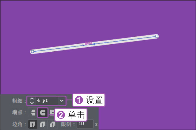 软件会根据设置的参数,绘制一条倾斜的直线段。为让直线段变得更粗,可以对它进行描边,执行“窗口>描边”菜单命令,打开“描边”面板,①在面板中将“粗细”设置为4pt,②单击“端点”右侧的“圆头端点”按钮