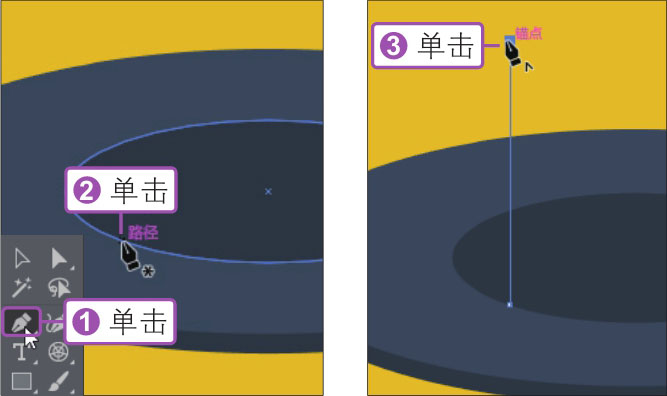 设置填充颜色为白色、描边颜色为“无”,①选择工具箱中的“钢笔工具”,②将鼠标指针移至所需的直线段起点并单击,定义第一个锚点,③在希望直线段结束的位置再次单击,添加第二个锚点。
