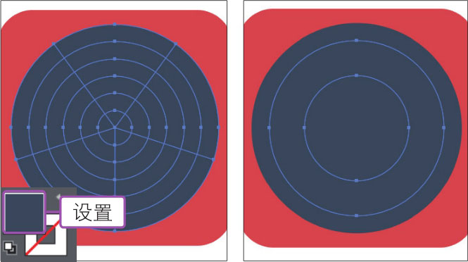使用“极坐标网格工具”可以创建具有指定大小和指定分隔线数目的同心圆。选择该工具后,可以在画板中单击并拖动来创建网格图形,也可以在画板中单击,打开“极坐标网格工具选项”对话框,设置更精确的参数来创建网格图形,具体操作步骤如下。