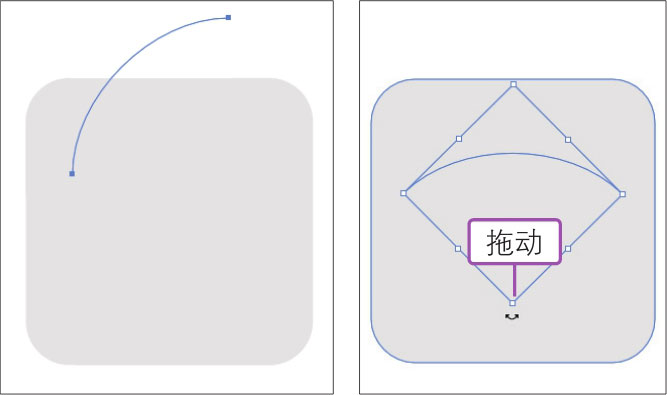 软件会在鼠标单击处绘制一条弧线。使用“选择工具”选中弧线,将鼠标指针移到编辑框右侧转角位置,单击并向下拖动,旋转弧线,再将其移到合适的位置。