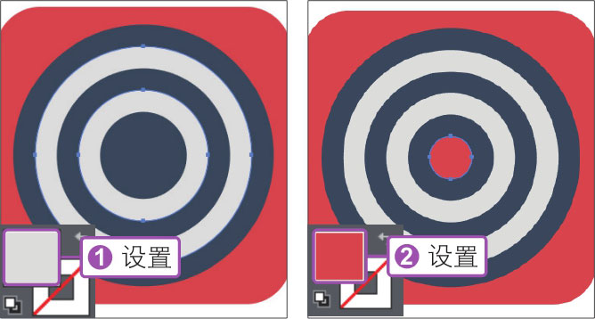 ①在工具箱中设置选中的两个圆形的填充颜色,然后使用“直接选择工具”选中最中间的圆形,②并在工具箱中设置填充颜色。