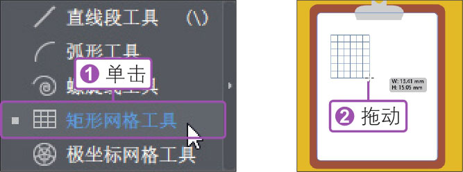 不放,①在展开的工具组中单击选择“矩形网格工具”,②将鼠标指针定位于文件夹左上方位置,单击并拖动鼠标。