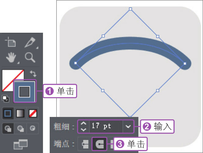 ①在工具箱中单击“描边”色块,启用描边,并设置描边颜色,打开“描边”面板,②在面板中设置“粗细”为17pt,③单击“圆头端点”按钮