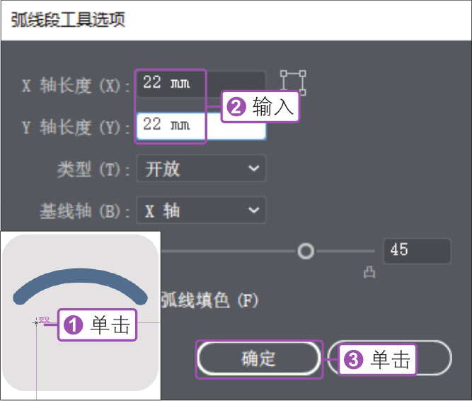 选择“弧线工具”,①将鼠标指针移到灰色圆角矩形中单击,打开“弧线段工具选项”对话框,②在对话框中输入“X轴长度”为22mm、“Y轴长度”为22mm,其他参数不变,③单击“确定”按钮。