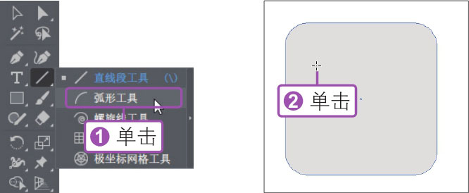 不放,①在展开的工具组中单击选择“弧形工具”,②在圆角矩形中需要绘制弧线的位置单击。
