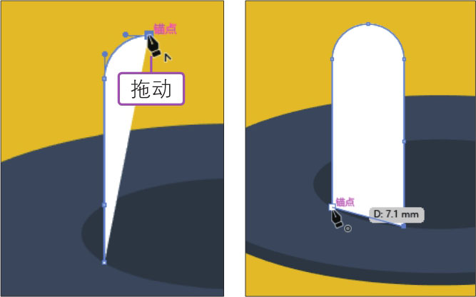 将鼠标指针移到需要绘制曲线的位置,单击添加一个锚点,并按住鼠标不放,拖动以设置要创建的曲线的斜度,然后松开鼠标,完成曲线的绘制。使用同样的方法绘制更多的直线和曲线路径,最后将鼠标指针定位在第一个锚点上,此时鼠标指针变为