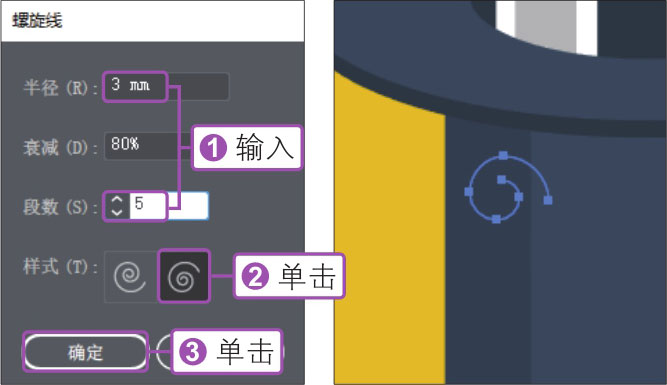 打开“螺旋线”对话框,①在对话框中输入“半径”为3mm、“段数”为5,②单击选择一种螺旋线样式,③设置好后单击“确定”按钮,即可在鼠标单击的位置创建一条螺旋线。