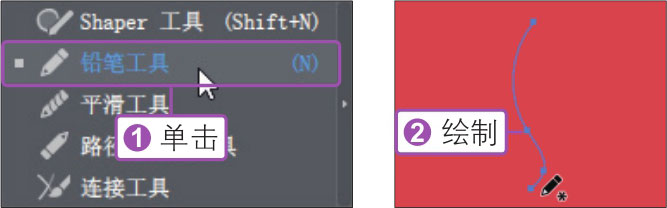 不放,①在展开的工具组中单击选择“铅笔工具”,②将鼠标指针定位到希望路径开始的地方,然后拖动鼠标以绘制路径。