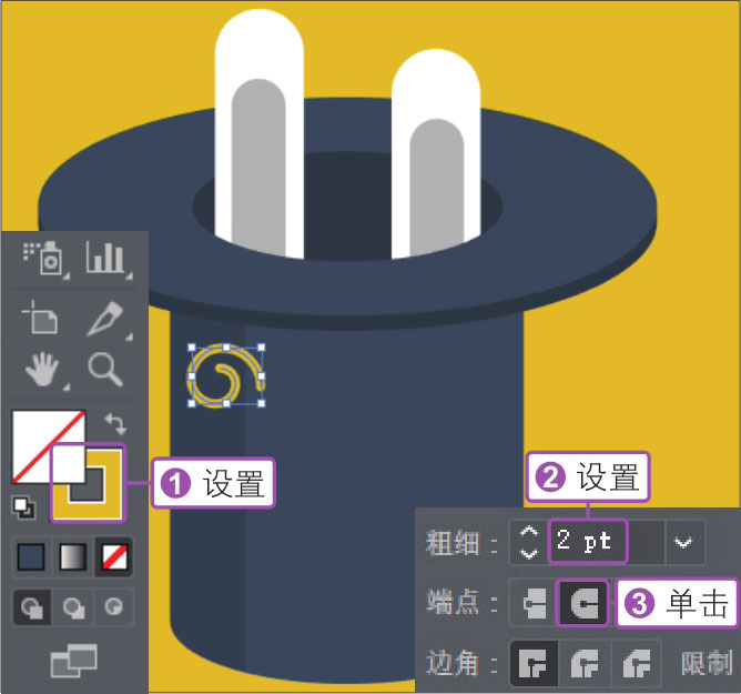 ①在工具箱中更改螺旋线的描边颜色,然后打开“描边”面板,②在面板中设置“粗细”为2pt,③单击“圆头端点”按钮