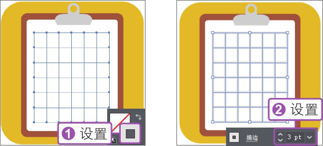 当拖动到所需大小后,释放鼠标,完成矩形网格的绘制。①在工具箱中设置矩形网格的描边颜色,②然后在“属性”面板中设置“描边”为3pt,突出矩形网格图形。