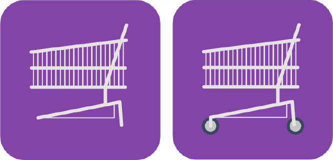 继续使用同样的方法,在紫色的圆角矩形中绘制出更多的直线段,组成购物车图形,最后在下方应用“椭圆工具”绘制购物车的轮子,完成第一个图标的设计。